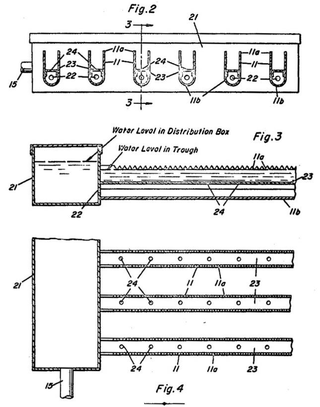 there has been developed a system of troughs which can be filled to a predetermined level and which will spill water through notches * * * Such * * * is disclosed in copending application S.N. 240,199 * * *. However, the apparatus of that patent application requires an overhead water